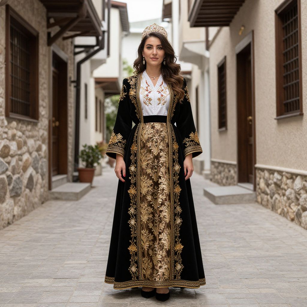 Photograph of a woman in an ornate black and gold embroidered traditional dress, standing in a narrow, stone-walled alleyway.