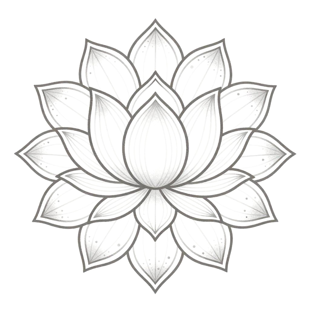Outline simple lotus flower mandala with balanced petals radiating outward, incorporating delicate linework and subtle dot accents, rendered in monochrome with soft gray shading to emphasize depth and symmetry, suitable for meditation and mindfulness themes.