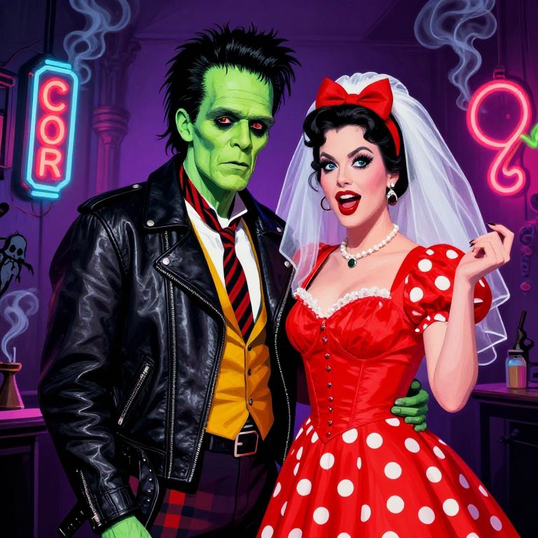 Rockabilly Frankenstein and Bride art portrait, emphasizing their rebellious expressions and quirky retro fashion, leather jackets and polka dot dress, surrounded by smoky neon signs and spooky gothic elements, painted with vivid pop art colors.