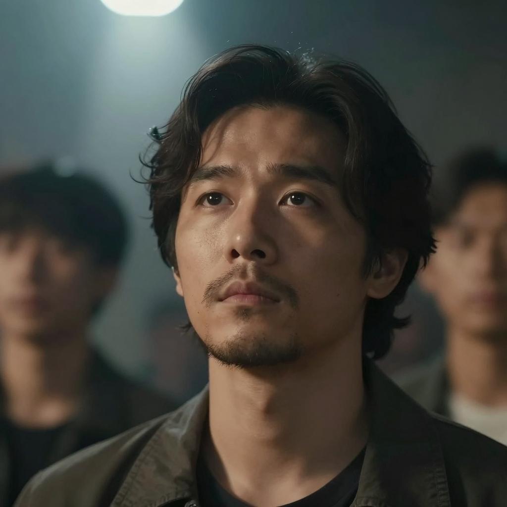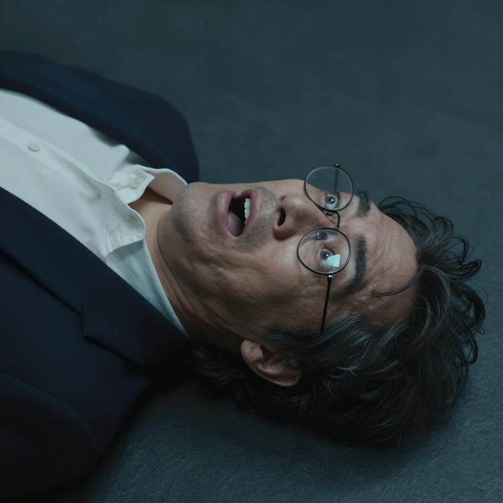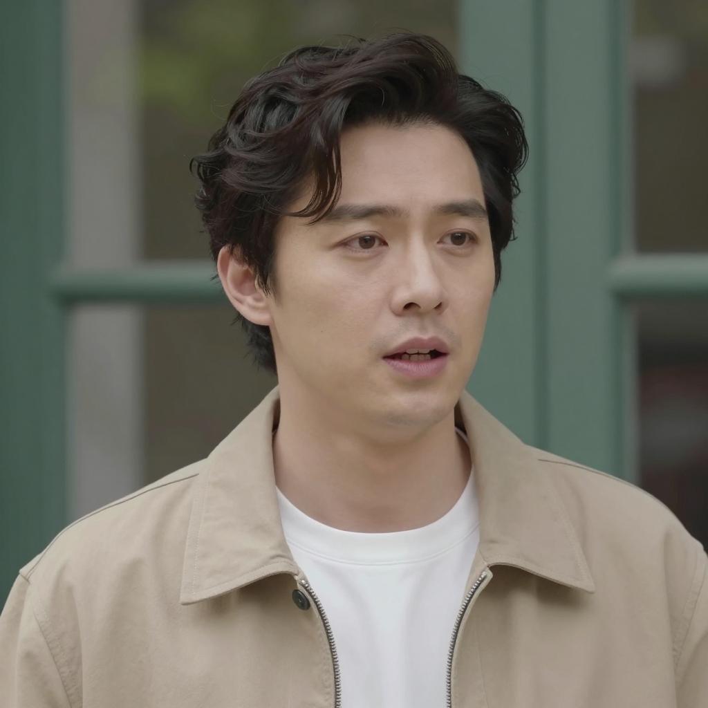 Man with medium-length dark brown hair, wearing large brown-framed glasses, light gray hoodie over white shirt, speaking with mouth slightly open. Background: kitchen with shelves, fridge with various magnets and notes, blurred. Upper body, facing slightly left. Two people visible.