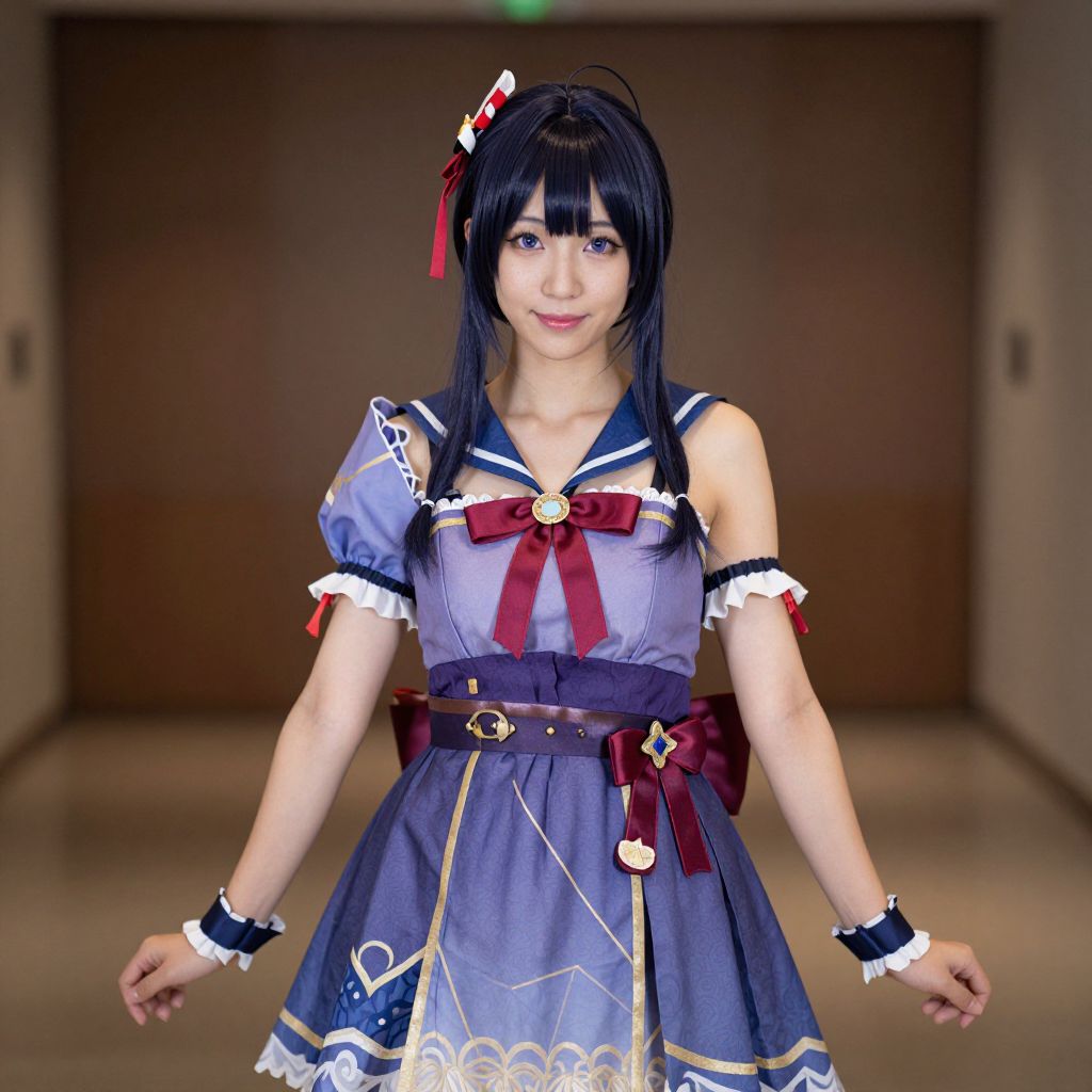 Digital CGI image of an Asian woman in a blue and purple anime-style sailor dress with red bows, white frills, and heart motifs, standing in