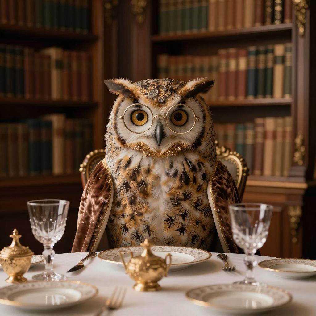 Ancient wise owl adorned with spectacles and a velvet robe seated at a fine dining table in a lush Victorian library filled with towering bookshelves, with crystal and porcelain plateware, f/1.4 200mm zoom shallow depth of field, ultra sharp photograph, (soft golden afternoon light:1.2) (masterpiece:1.2) (photorealistic:1.2) (bokeh) (best quality) (intricate) (8k) (HDR) (cinematic lighting) (sharp focus)