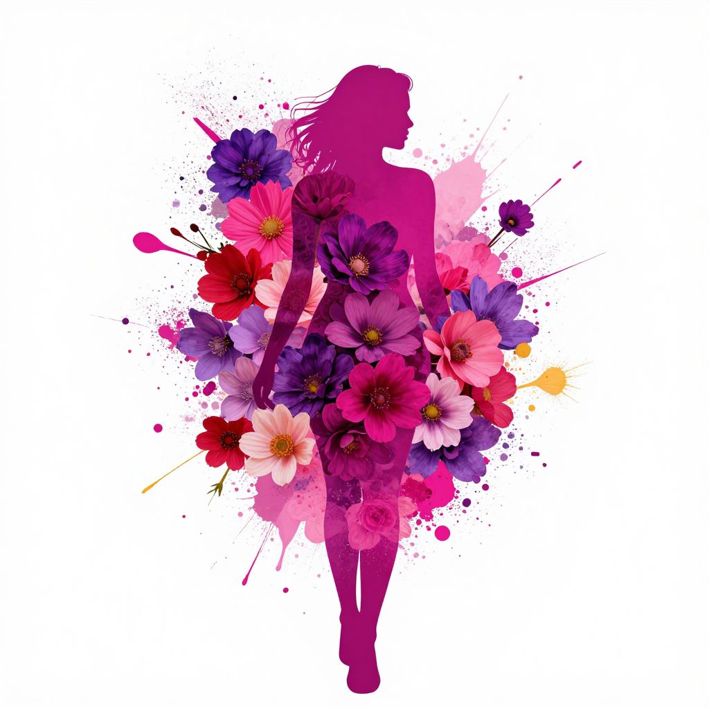 A silhouette of a woman is adorned with colorful paint splashes and exploding flower patterns in shades of magenta and purple.