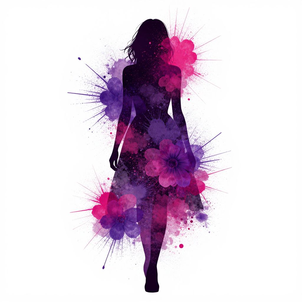 Silhouette of a woman with purple and pink floral splatter background, standing against white, abstract watercolor style.