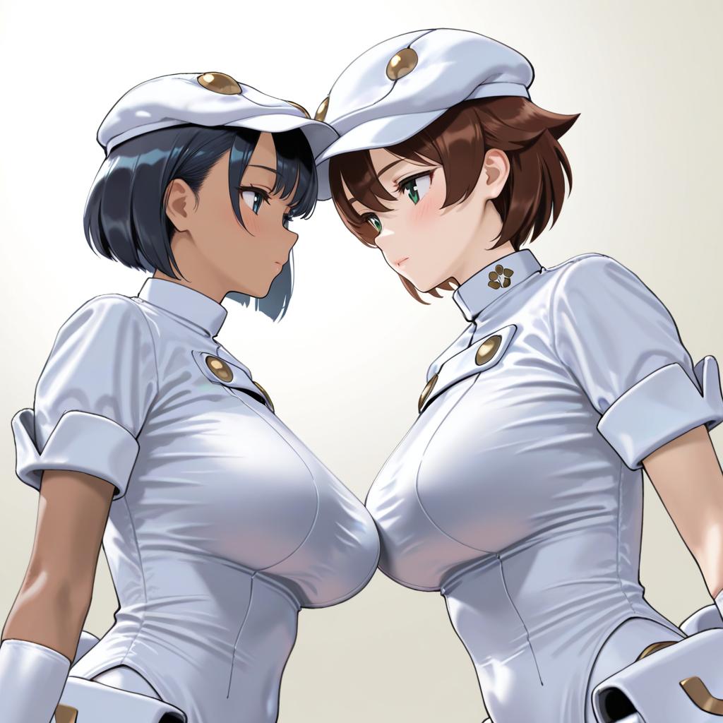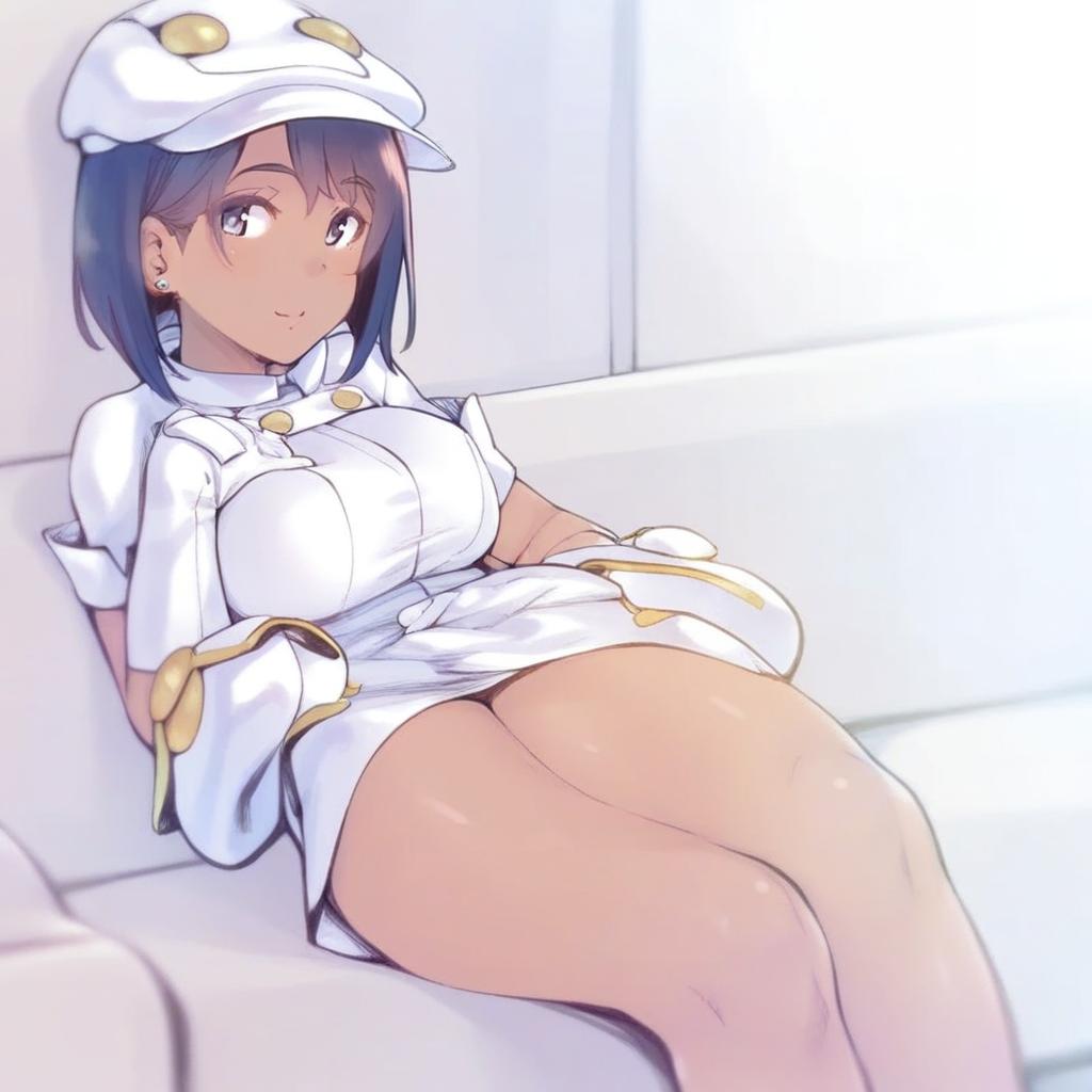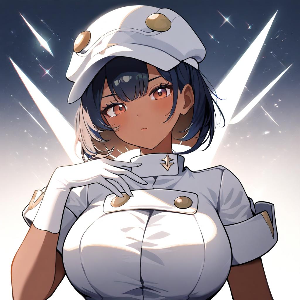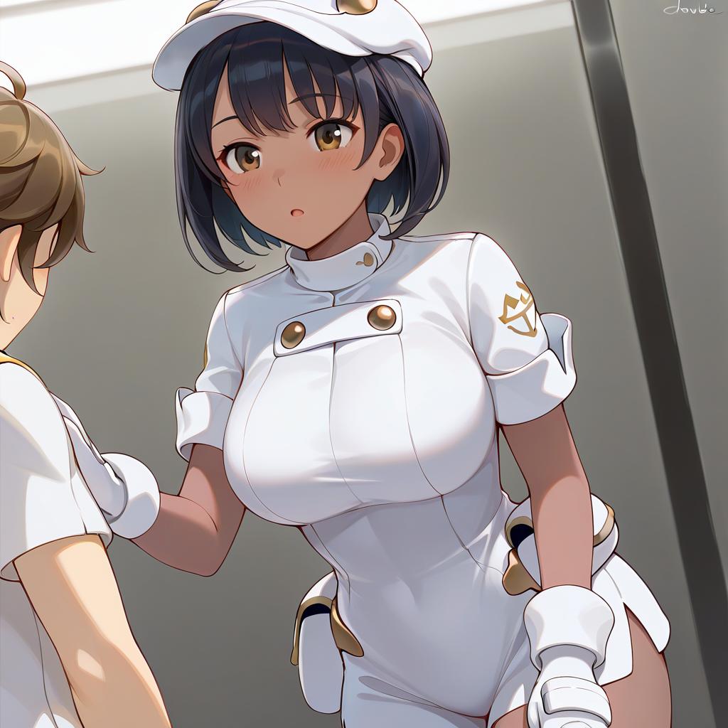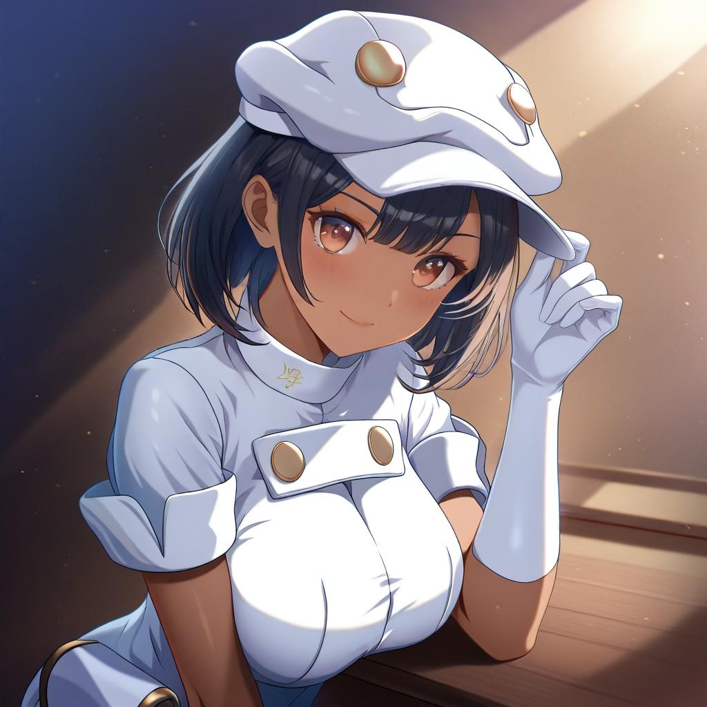 Aether foundation employee, pokemon, 1girl, dark-skinned female, brown eyes, short hair, black hair, brown hair, large breasts, aether foundation uniform, white headwear, white gloves, hat, short sleeves, by artist tomoshibi hidekazu, animagine