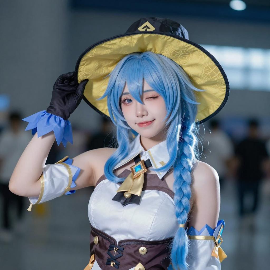 Photograph of a person cosplaying with long, light blue hair in twin braids, wearing a black and yellow hat, white and brown jacket, and gray shirt. They are smiling, holding the hat with both hands, against a blue-lit background.