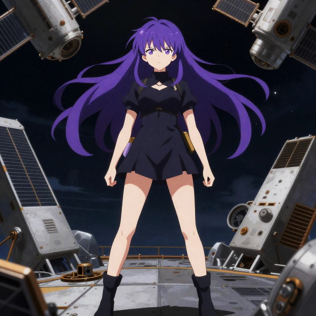 Ecchi art of space witch standing confidently in a orbital satellite graveyard, her nebula violet hair flowing in the wind, intense gaze, high-detail anime rendering