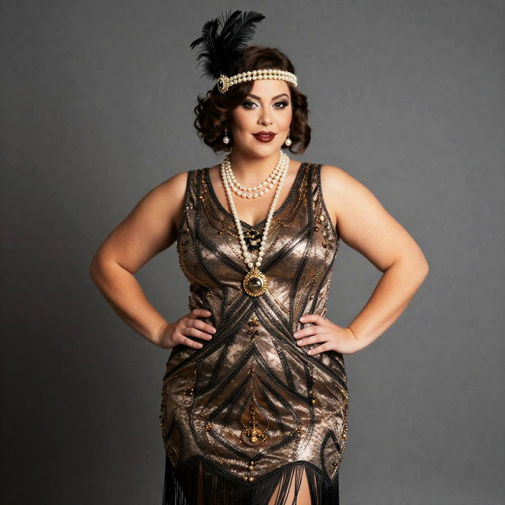 Flapper Fancy Dress Plus Size, dressed in a flapper dress and feathered accessories