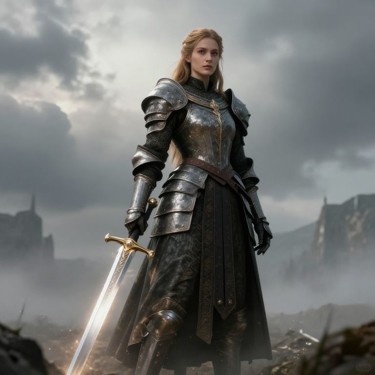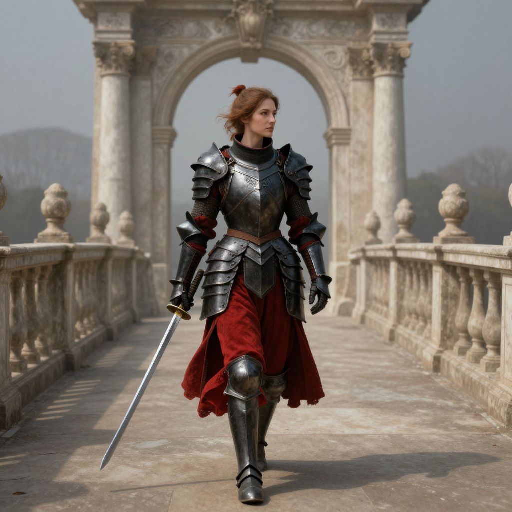 Photorealistic digital art: armored, red-skirted female knight with brown hair, holding a sword, walks on ancient stone bridge with ornate