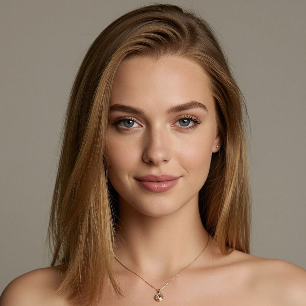 Blonde brown long bob, 1girl, solo, jewelry, realistic, necklace, blue eyes, lips, long hair, blonde hair, brown hair, portrait, smile, looking at viewer