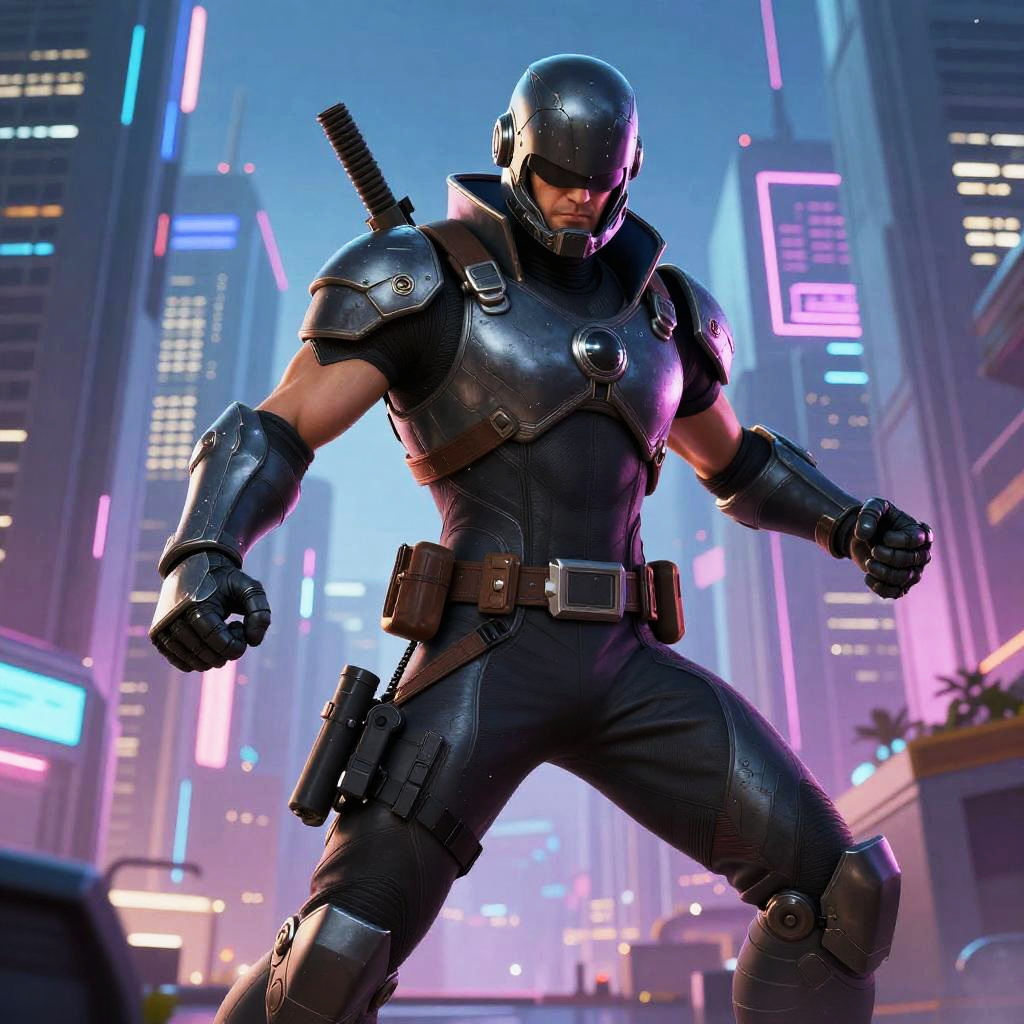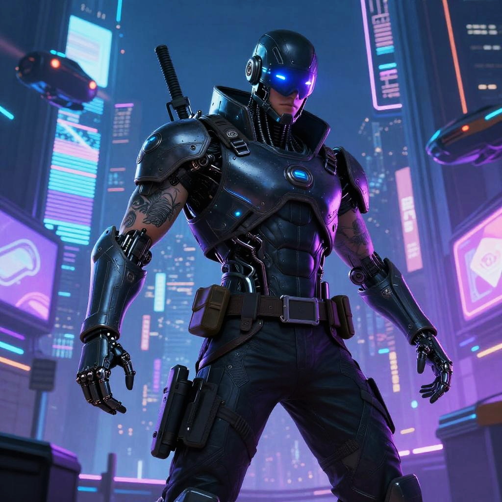 CGI image of a futuristic, armored superhero in sleek black armor with glowing blue accents, neon-lit holographic screens, and cybernetic enhancements