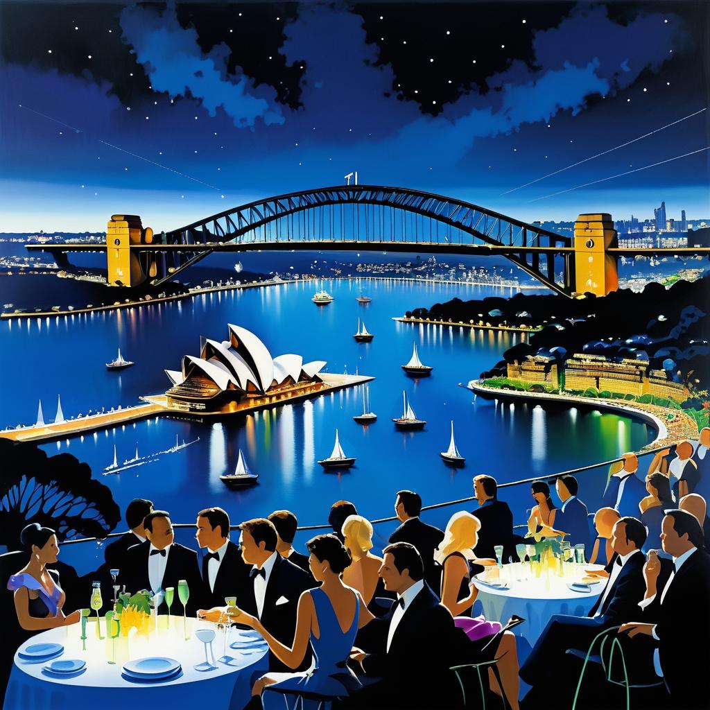 Night Photography Cocktail party with Sydney Harbour bridge in view above crowd, Stunning Landscape Painting, Sydney Harbour, Vibrant, by Paul Cezanne and Peter Elson, Tom Hammick, Stream, Chiaroscuro, Cinematic Lighting, intricate Detail,