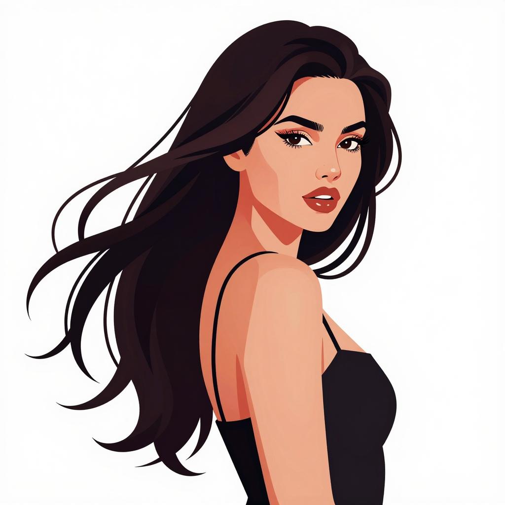 Digital illustration of a confident woman with long, flowing dark hair and smooth skin. She is wearing a black sleeveless top and has a poised expression with bold makeup. The artwork features vibrant colors and clean lines on a white background, highlighting a modern and stylish aesthetic.
