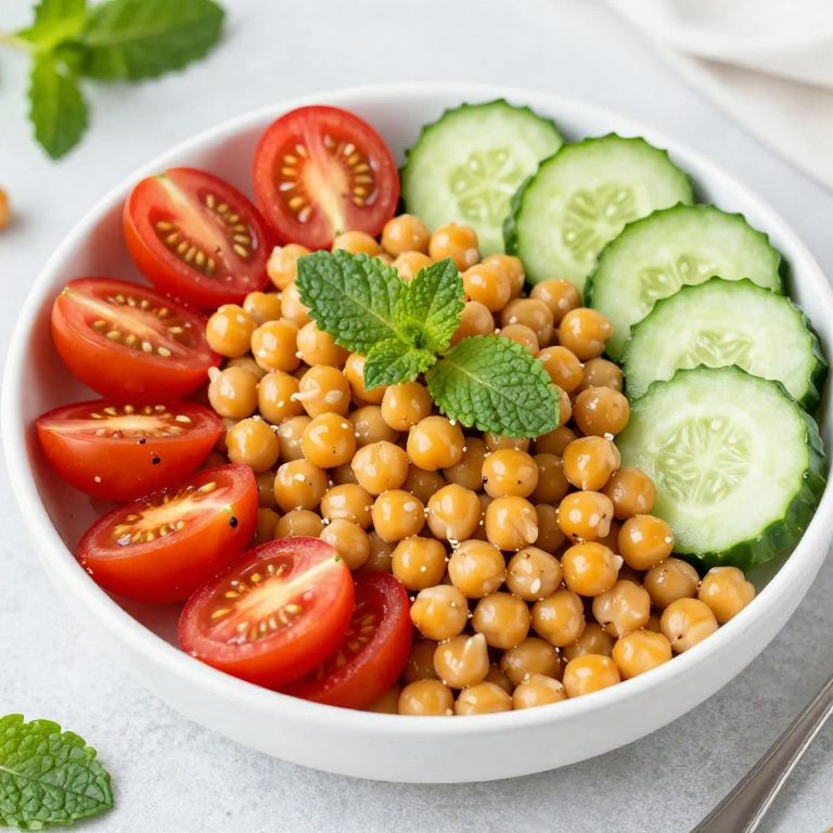 Vibrant chickpeas, halved cherry tomatoes, and sliced cucumbers are artfully arranged in a shallow white bowl, garnished with fresh mint leaves, creating a refreshing and colorful Easy Spicy Chickpea Salad.