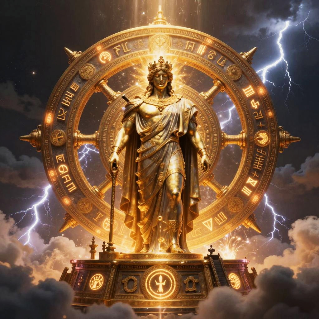 Greek god generator concept art, a mystical ancient machine adorned with glowing runes and divine symbols, surrounded by clouds and lightning, emanating a golden aura of power, in a surreal mythological style, highly detailed, cinematic lighting