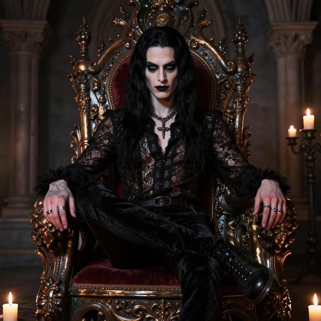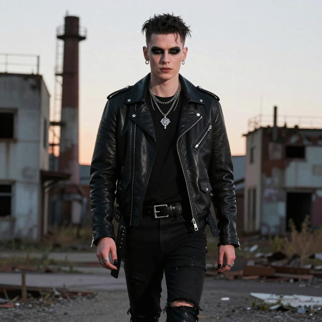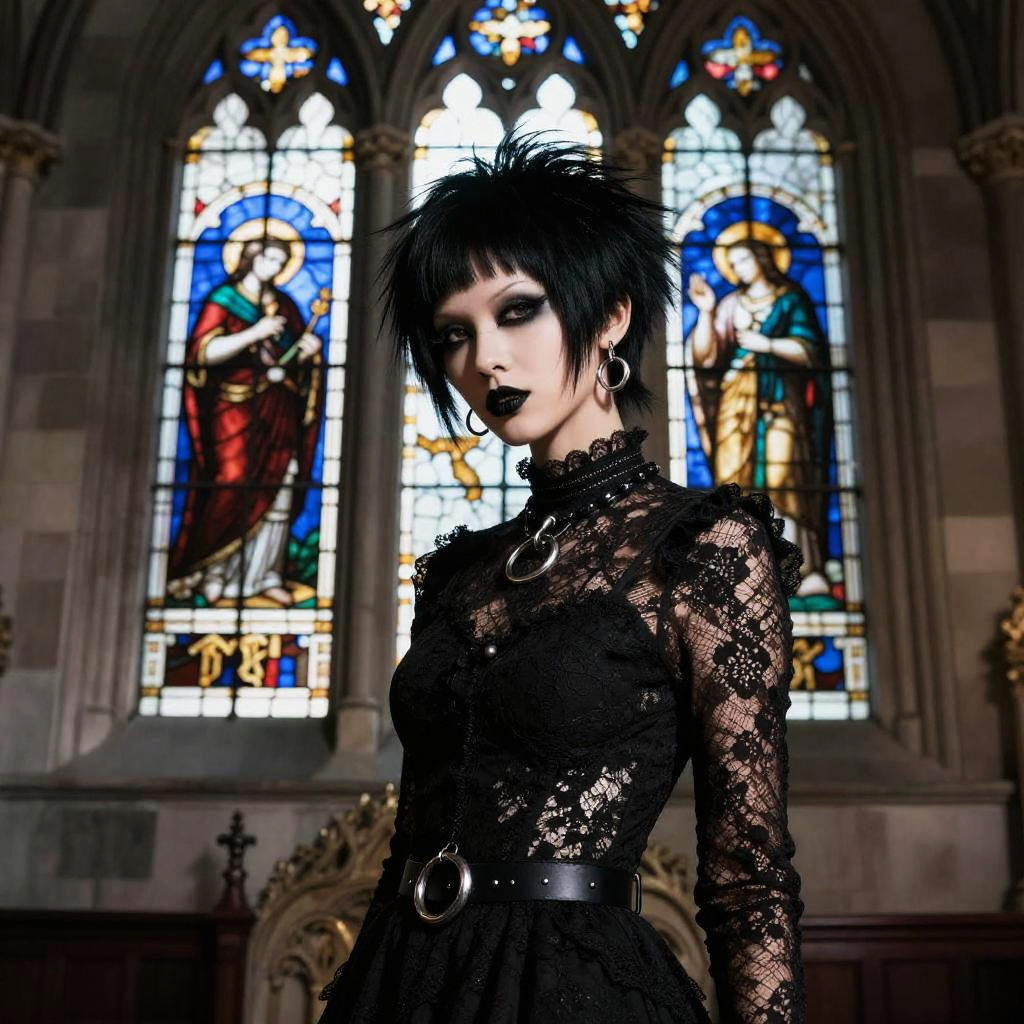 Goth guy in a black trench coat and boots, holding a skull, standing beside a weathered gothic cathedral with stained glass windows glowing eerily in the night