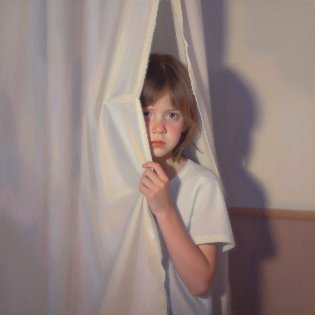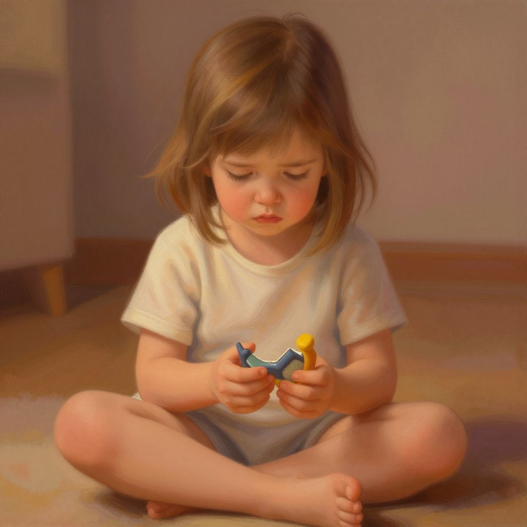 Conserned child holding a broken toy, sitting on the floor of a dimly lit room, soft shadows, emotional expression, warm pastel colors, focus on eyes and delicate hands, digital painting style with rich texture