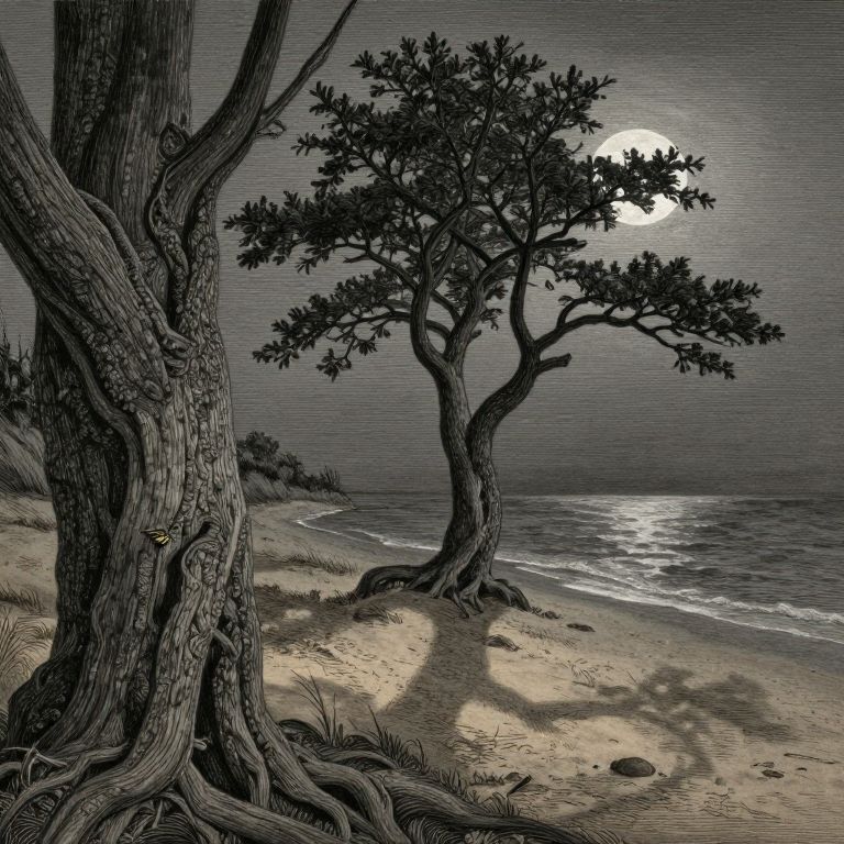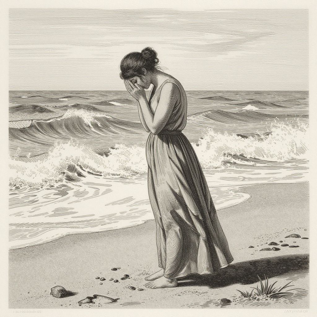 A woman in a long dress stands on a beach, praying with her head bowed as waves crash in the background, depicted in a lithograph.