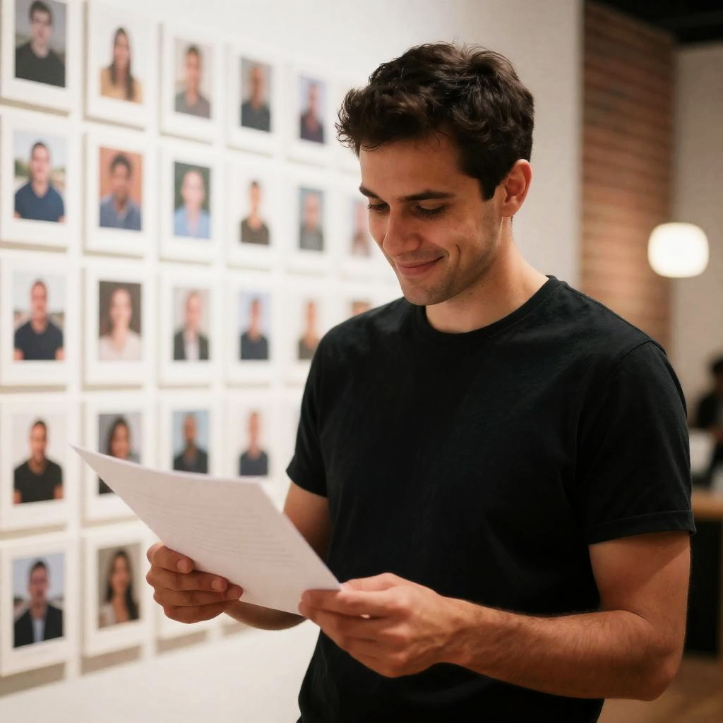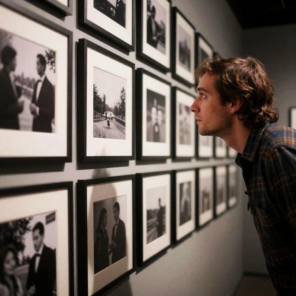 A photograph of a man with medium-length brown hair and a plaid shirt, leaning forward, gazing at a wall of black-and-white photographs. The wall is filled with framed pictures, each depicting various scenes and people. Dim lighting. The man's expression is focused.