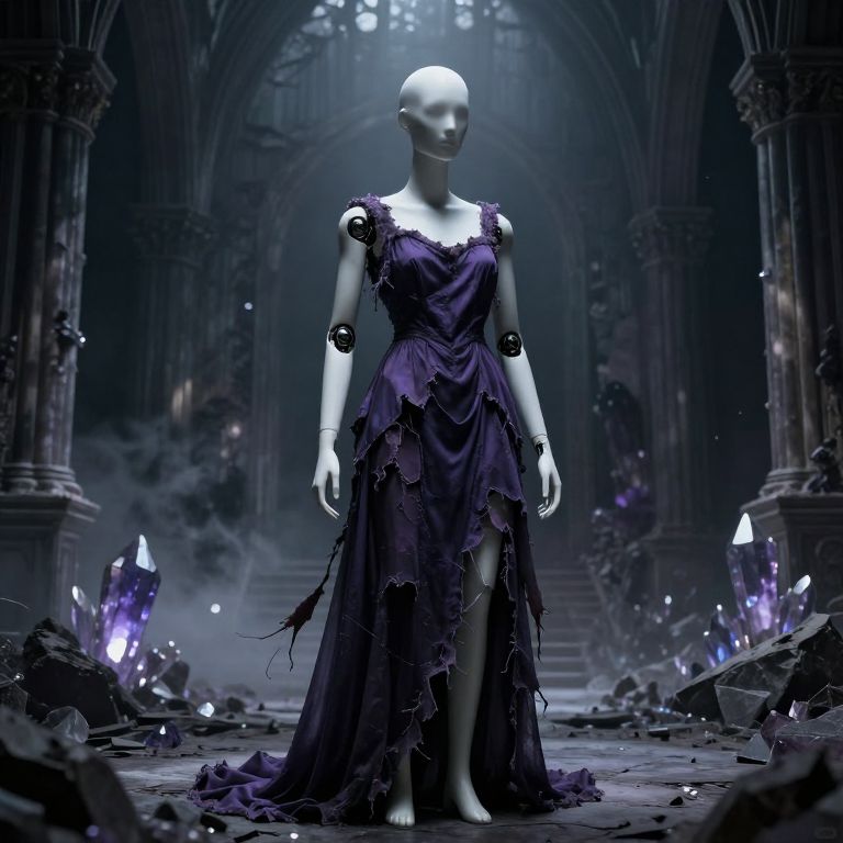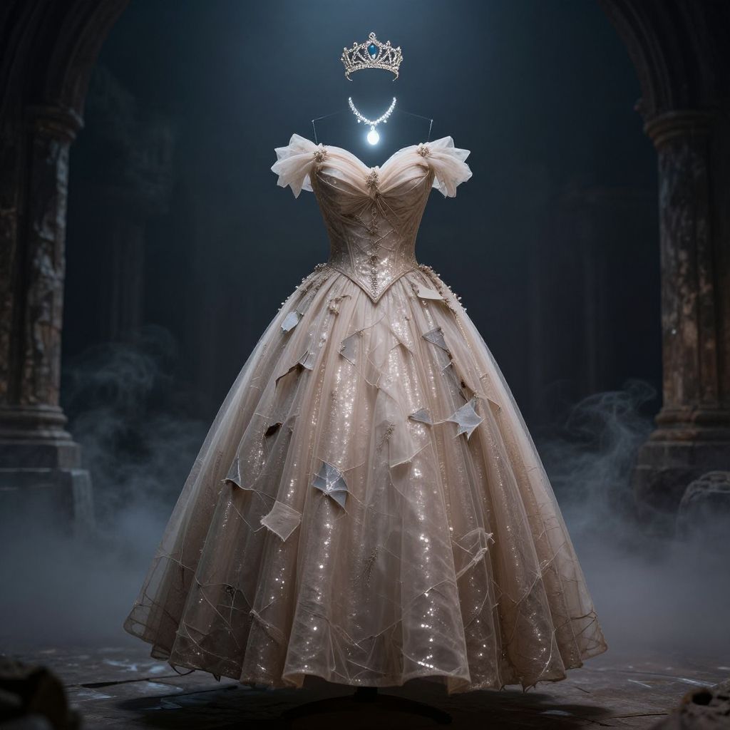 Headless prom queen costume featuring a tattered 1950s style prom gown, shimmering yet distressed, floating headless gown with a glowing necklace, broken tiara levitating, smoky background with ancient castle ruins, mysterious and chilling ambiance, high detail