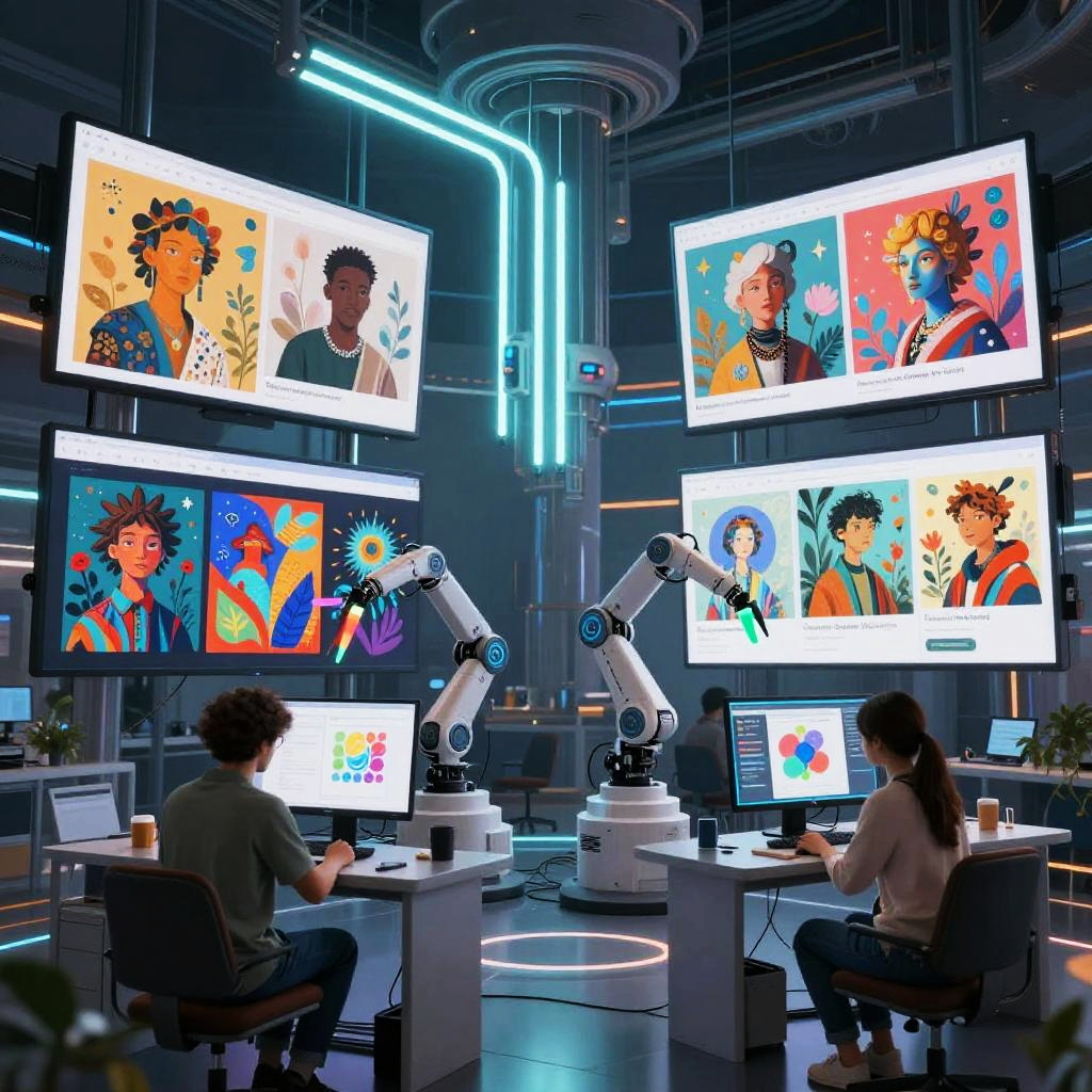 Free AI art sites visualized as a futuristic creative hub with numerous screens displaying AI-generated art pieces, glowing neon tubes, robotic arms painting, and people engrossed in digital art creation, emphasizing empowerment through technology.