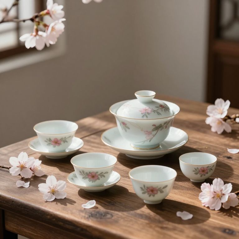 Beautify a delicate porcelain tea set arranged on a rustic wooden table, surrounded by scattered cherry blossoms, soft morning light creating gentle shadows, intricate details on the china patterns, intimate and serene still life composition, photorealistic rendering.