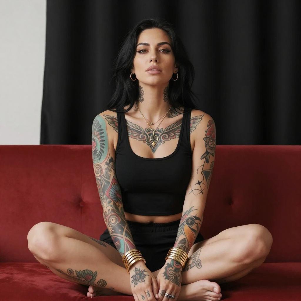 Tattooed Woman on Velvet Couch