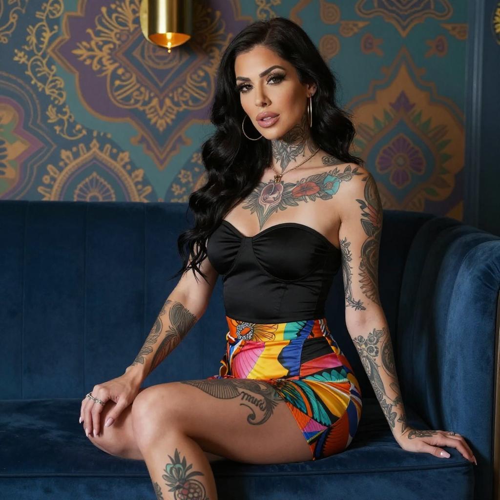 Photograph of a tattooed woman with long dark hair, wearing a black strapless top and colorful skirt, sitting on a blue velvet couch. She has extensive tattoos on her arms, chest, and legs. The background features a patterned, multicolored wall with a hanging brass light fixture.