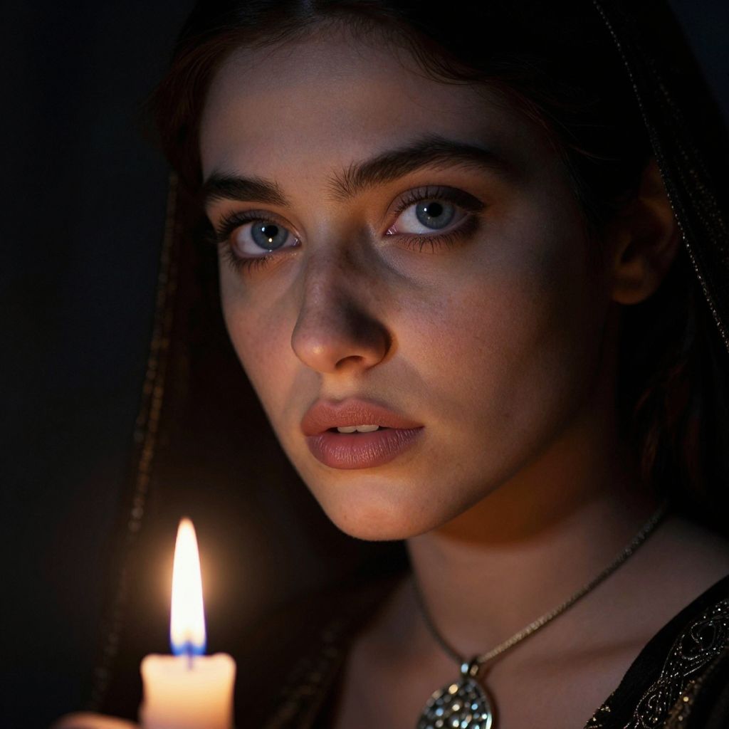 Envision a captivating portrait of a Middle Eastern woman with piercing blue eyes and delicate fair skin. The soft glow of a nearby candle illuminates her face in a darkened room. An intricate silver pendant adorns her neck, hanging from a fine chain, drawing attention to her intense gaze as she looks off into the distance, piercing through the shadows. Photographed from a unique low-angle perspective, the light accentuates her porcelain complexion and faint freckles gracing her cheeks, while the dancing candlelight casts shadows that enhance her sculpted cheekbones and full lips. This ultrarealistic portrait masterfully blends mystery and vulnerability, evoking emotions ranging from intrigue to empathy. It invites viewers to delve into the intimate depths of her character, showcasing both her beauty and inner strength in a captivating close-up.