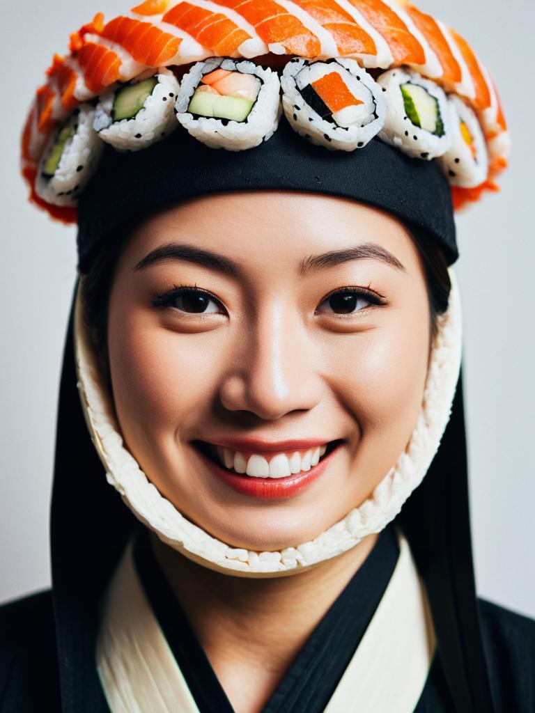 Close-up portrait of a cheerful young Asian woman wearing a creative sushi roll costume hat. The hat features realistic sushi pieces and sliced salmon arranged around the top and sides, resembling traditional Japanese sushi rolls. The woman is smiling and dressed in black and beige clothing.