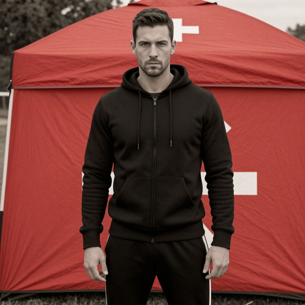A man, athletic zip-up jacket, sleek black with reflective details, fitted sweatpants, soft fleece material, drawstring waist, lush green cliffs, turquoise waters below, ib technicolor film stock, confident expression Man has masculine face and piercing eyes