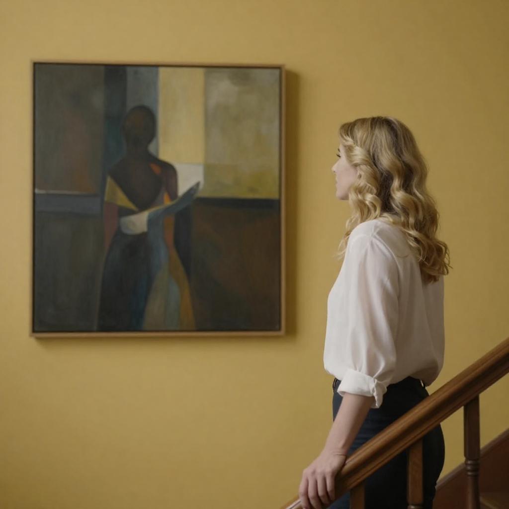 Photograph of a blonde woman with wavy hair, leaning on a wooden staircase railing, gazing at an abstract painting with dark and yellowish hues on a ured yellow wall. She wears a white blouse and looks contemplative. The painting features a shadowy figure amidst swirling colors.