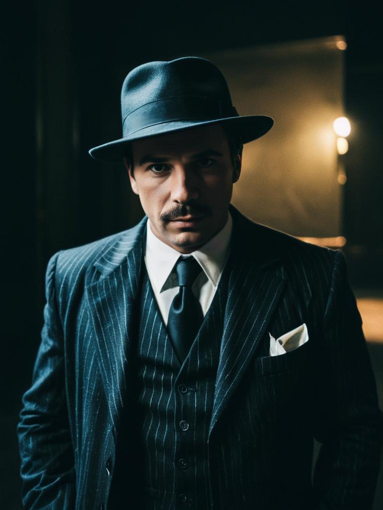 Man in Gangster Costume, cinematic realism, dramatic editorial cosplay photo