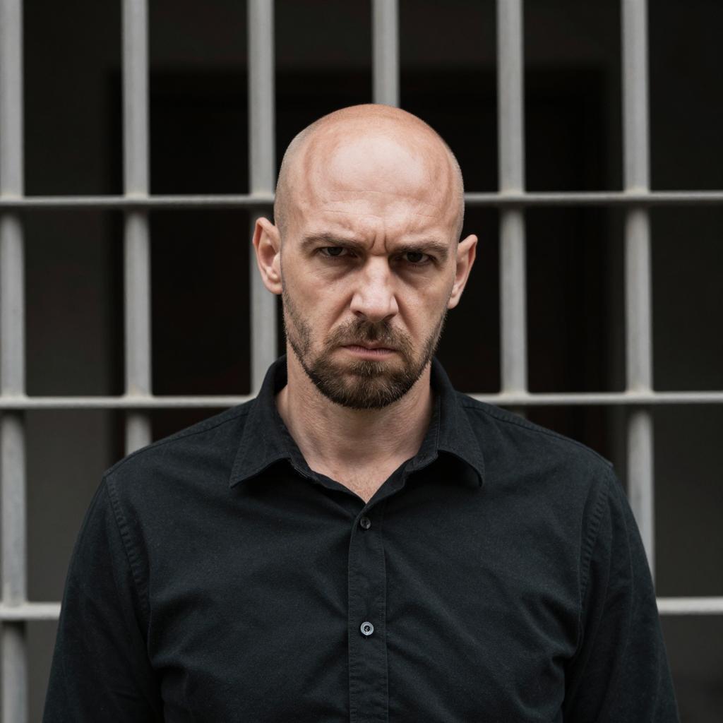 A bald man with a short goatee, wearing a black shirt, standing in front of a barred window. His expression is serious and slightly annoyed. The background is dark. The man is positioned slightly to the left. The bars are light-colored and vertical.