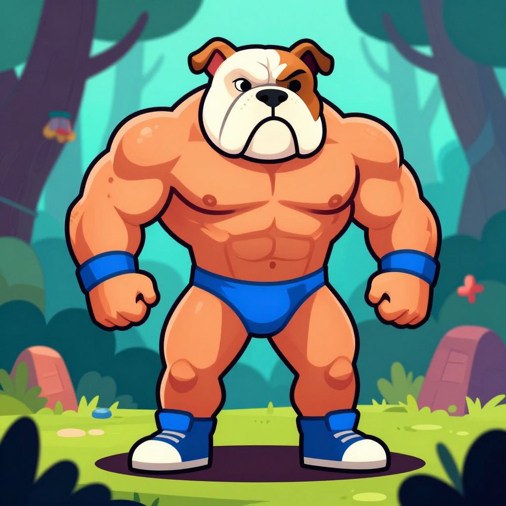 Vector illustration of a muscular bulldog with a Mr. Olympia bodybuilder physique, featuring exaggerated muscles and a shredded style. The character is wearing blue briefs, wristbands, and shoes, standing confidently in a vibrant, magical forest gym setting.