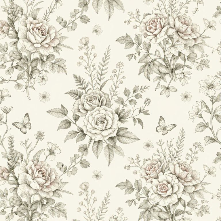 Garden aesthetic wallpaper depicting a whimsical floral pattern with blooming roses, ivy vines, and blooming wildflowers intertwined with butterflies, rendered in soft muted tones and intricate, hand-drawn line art style.