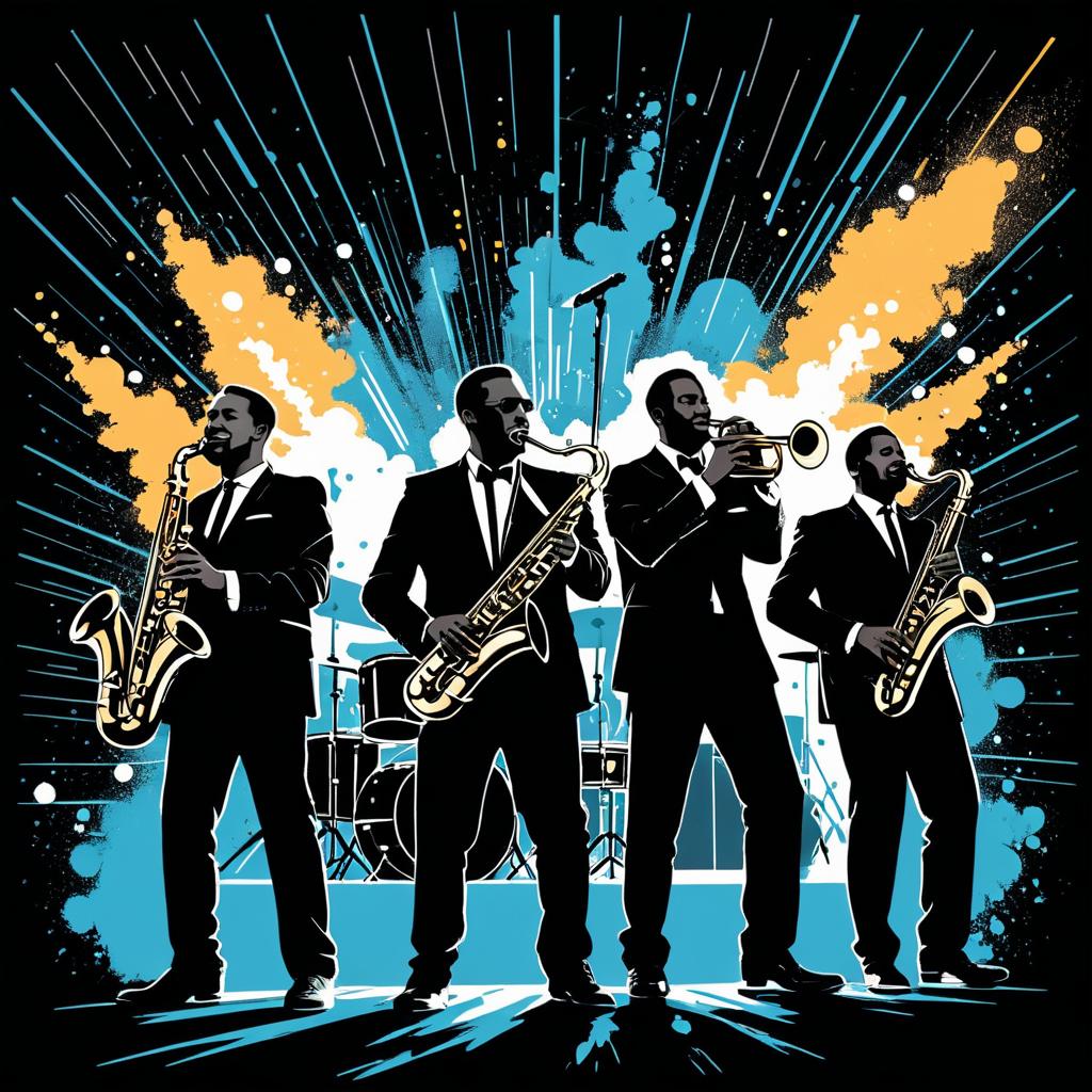 2D vector illustration of a four-member jazz band consisting of musicians playing saxophone and trumpet. The musicians are dressed in black suits with white shirts and ties, standing against a dramatic background featuring blue and orange powder explosion effects. The image highlights strong outlines, bold traces, and high contrast with flat colors and flat lighting, capturing a dynamic musical performance scene.