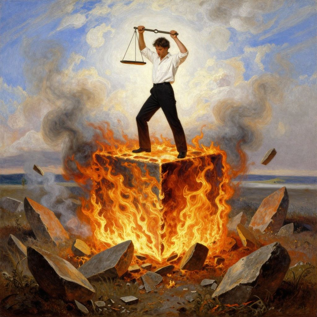 In this captivating painting, a man stands confidently atop a large, fiery cube, using a scale to draw cuboids in a dramatic, burning field. The cube, glowing with intense flames, is surrounded by a chaotic landscape of shattered rocks and billowing smoke. The man, dressed in a crisp white shirt and black pants, holds the scale with both hands, his posture suggesting a sense of control and mastery over the chaotic scene. The sky above is a mix of blue and white clouds, adding a stark contrast to the fiery elements below. The overall composition, with its dynamic interplay of colors, textures, and shapes, evokes a sense of neoclassicism and academic art, reminiscent of Thomas Cole's work. The scene is bathed in a soft, ethereal light, creating a surreal and otherworldly atmosphere.
