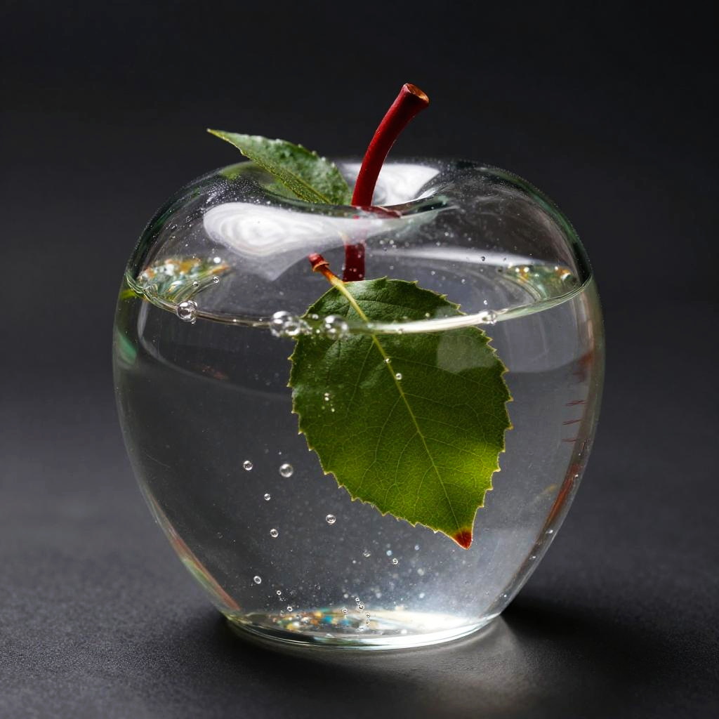 Photograph of a clear glass apple-shaped container filled with water, featuring a single green leaf and a red stem sticking out. Bubbles are visible inside the water, and the container is illuminated from below, creating a reflective, glossy effect. The background is dark, making the apple-shaped glass stand out prominently. The overall style is modern and minimalistic.
