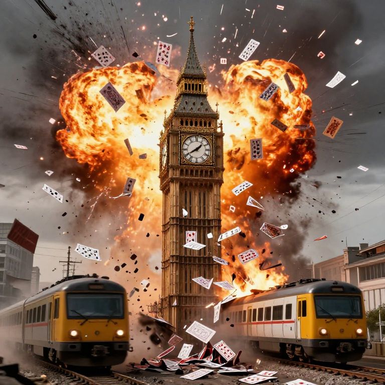 Photograph of London's Big Ben engulfed in fiery explosion, surrounded by flying playing cards, with two yellow trains in foreground.