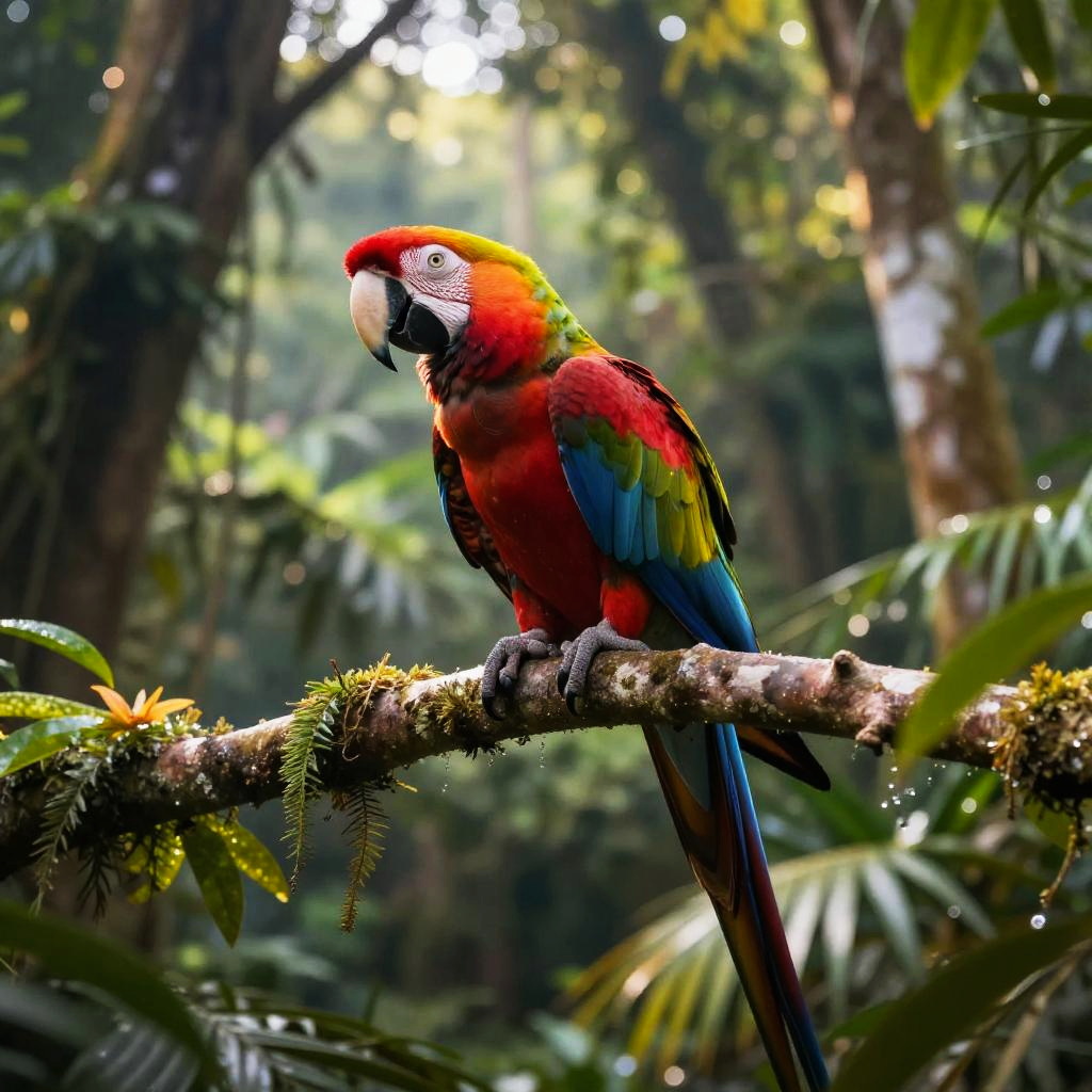 Vibrant scarlet macaw perched confidently on dense tropical rainforest canopy soaked in sunlight, in color-rich wildlife portraiture; heroic stance, warm rim light, detailed textures and fine fur/skin, expressive eyes, atmospheric perspective, low-angle dramatic view, leading lines, balanced rule-of-thirds composition, soft background separation, high dynamic range feel, ultra sharp subject, natural color grade, subtle haze, microcontrast on edges, immersive realism, SDXL, 8k resolution
