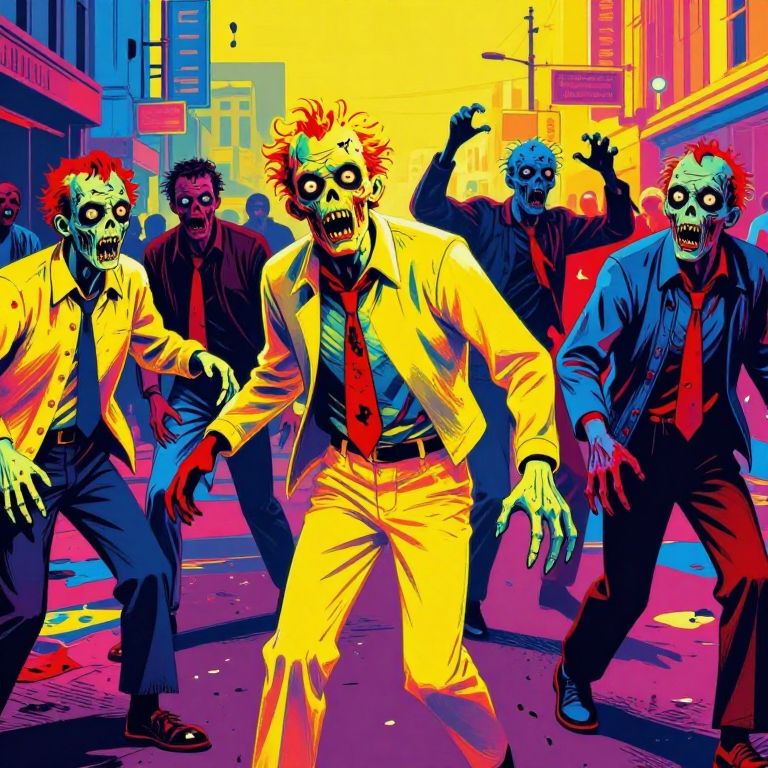The image depicts a vibrant, stylized depiction of a zombie invasion, reminiscent of Andy Warhol's pop art style. The scene is filled with a chaotic assembly of zombie figures, each rendered in a bold, neon color palette that includes shades of yellow, blue, and red. The zombies are depicted in various poses, some reaching out with arms extended, while others are in mid-stride, creating a sense of movement and urgency. The background is a mix of urban elements, with buildings and signs faintly visible, adding to the urban setting. The overall composition is dynamic, with the zombies arranged in a somewhat scattered formation, some in the foreground and others in the background, creating depth and a sense of scale. The interplay of colors and shapes gives the image a lively, almost surreal quality, capturing the essence of a zombie apocalypse in a visually striking manner.
