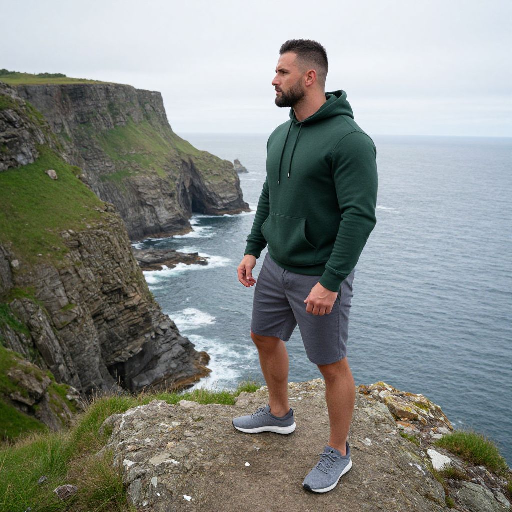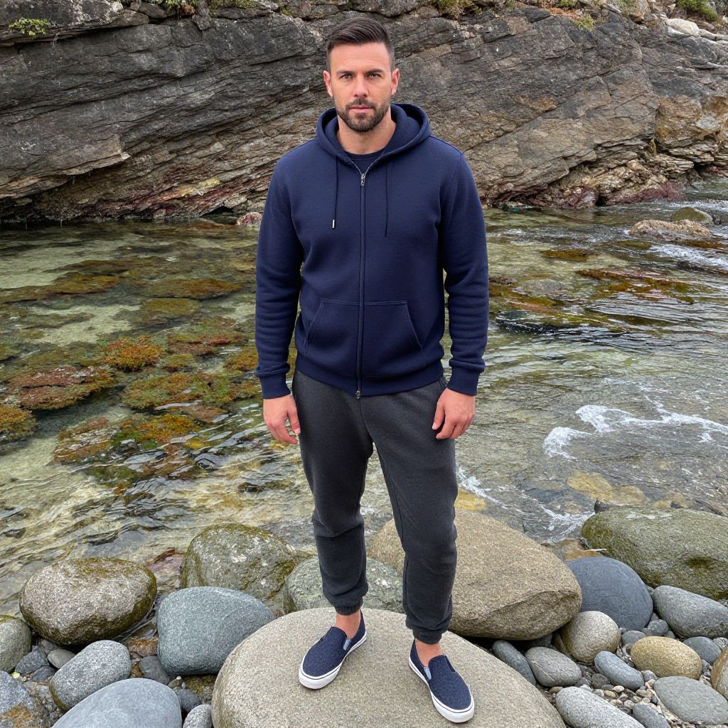 A man, navy blue zip-up hoodie, charcoal fleece jogger pants, slip-on canvas shoes, sporty look, secluded rocky inlet, vibrant tide pools teeming with life, camera obscura style, relaxed expression, gentle waves lapping against smooth stones. Man has masculine face and piercing eyes