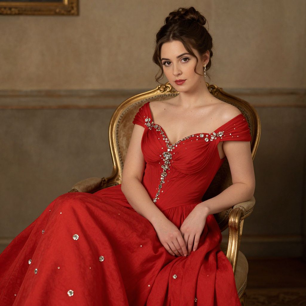 A woman in a vibrant red gown adorned with sparkling embellishments sits elegantly on an ornate chair, exuding timeless beauty against a softly lit, vintage-inspired backdrop, reminiscent of a classic oil painting by Rob Hefferan.