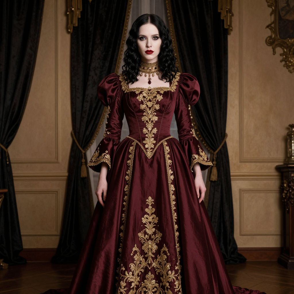 A photograph of a pale woman with dark, wavy hair and striking red lipstick, standing confidently in an ornate room. She's wearing a deep burgundy, floor-length gown with gold embroidery and puffed sleeves, featuring a dramatic high collar. The background includes rich, dark curtains and a warm, beige wall with paneling. The overall vibe is gothic and elegant.