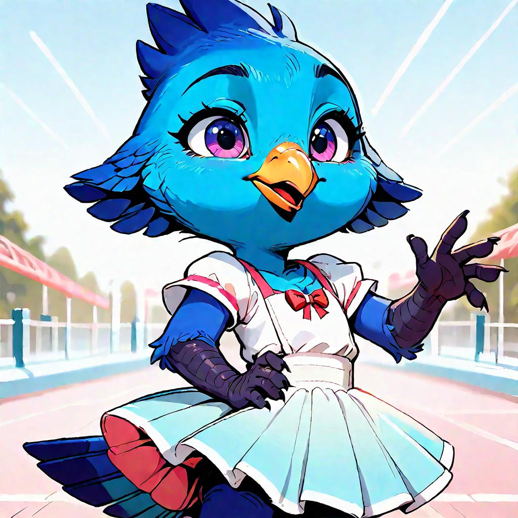 Illustration of a young anthropomorphic blue bird wearing a white dress with a red bow and a light blue tutu. The bird character has large purple eyes, a yellow beak, and feathered arms with dark gloves. The background shows a blurred dance hall or dance room, suggesting the bird is performing a solo dance.