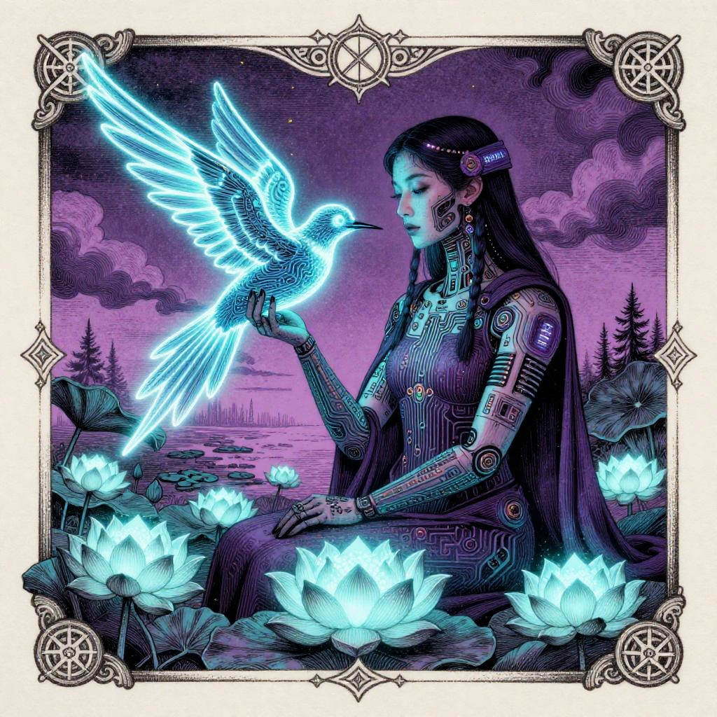 A surreal, vaporwave-style etching depicting a serene cybernetic priestess adorned with intricate circuit tattoos, seated among glowing lotus flowers. She gently embraces a luminous neon blue hummingbird with radiant feathers. The scene features a twilight haze sky with drifting clouds, rendered in an electric cyan and magenta palette, highlighted by meticulous crosshatching and soft chiaroscuro. The image is framed by an ornate tarot-style border with arcane sigils, evoking a mystical aura with a hand-engraved and archival print quality finish.