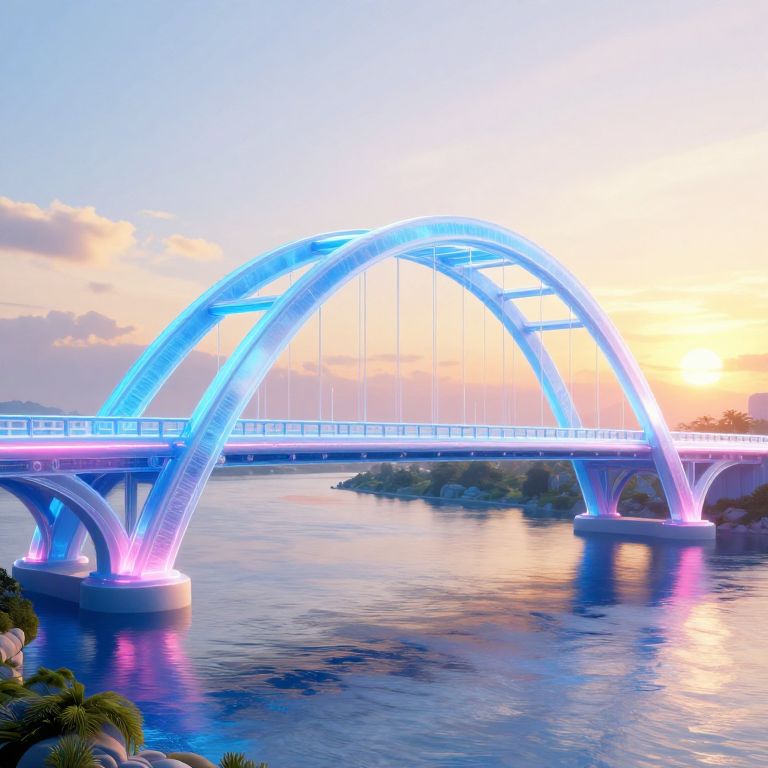 A cyberpunk-inspired 3D render depicts an iridescent bridge of frozen light arching over a serene river, blending vibrant blue and pink hues against a golden-hour sunset, creating a surreal connection between reality and imagination.