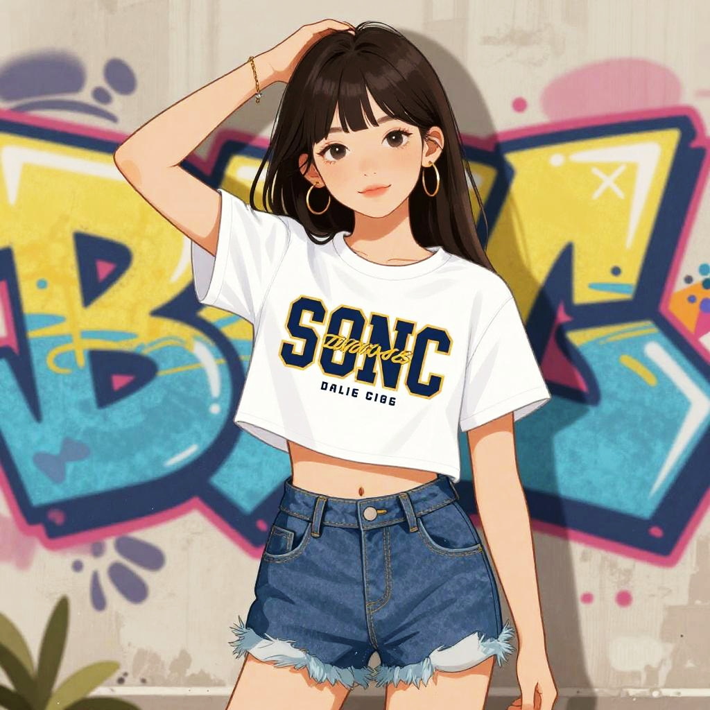 Crop top for 12 year girl, trendy fashion illustration, young girl posing confidently, urban street style, vibrant colors, graffiti wall backdrop, dynamic lighting, digital art style