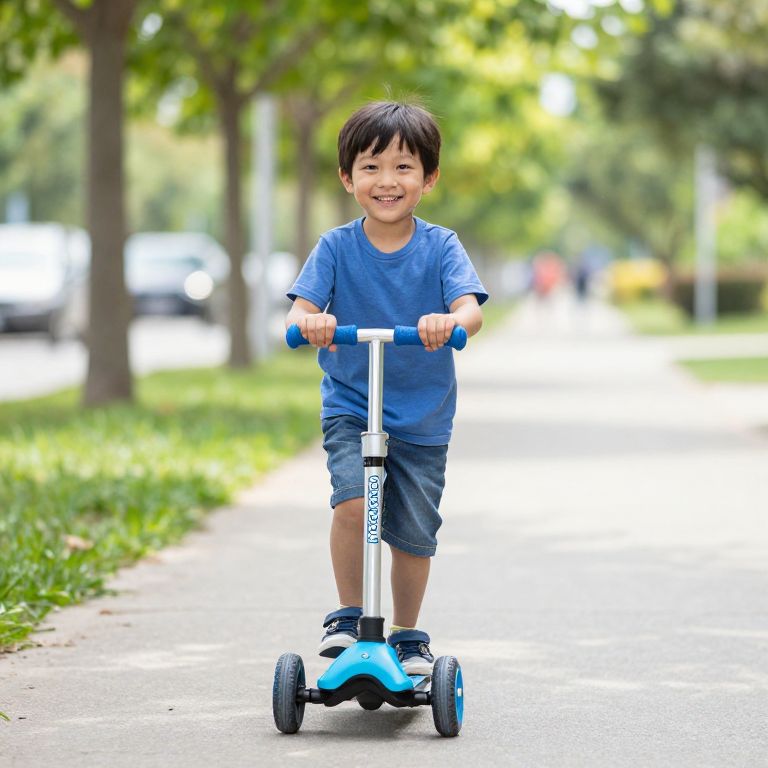 Boy riding a vibrant blue Primo Ride On Push Scooter along a tree-lined sidewalk, smiling joyfully as he glides through a sunny outdoor setting.